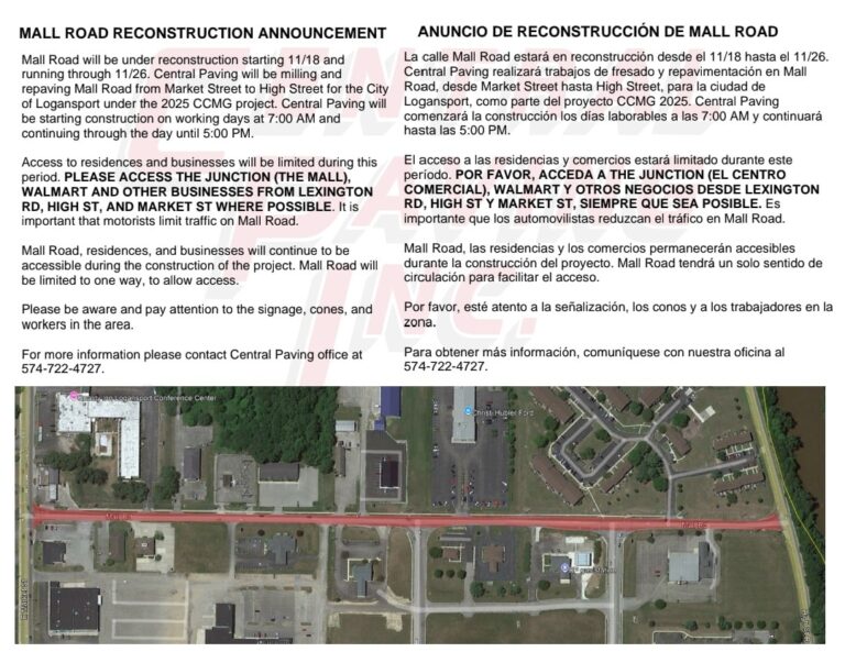 Mall Road will be under reconstruction starting Nov. 18 and running through Nov. 26, 2025. Central Paving will be milling and repaving Mall Road from Market Street to High Street for the City of Logansport under the CCMG project. Central…