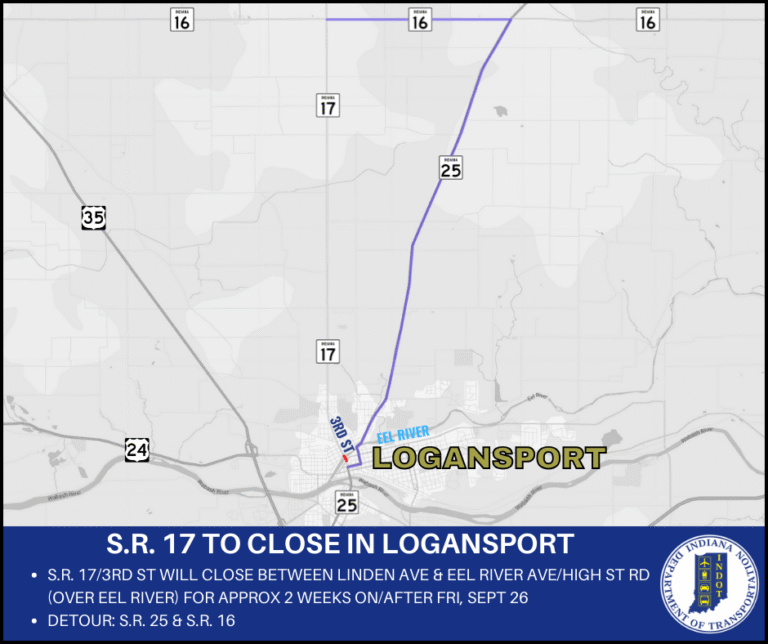 CASS COUNTY, Ind. – Indiana Department of Transportation contractor Superior Construction Co Inc will close State Road 17/3rd St between Linden Ave and Eel River Ave/High St Ave on or after Friday, September 26. State Road 17 will be closed…