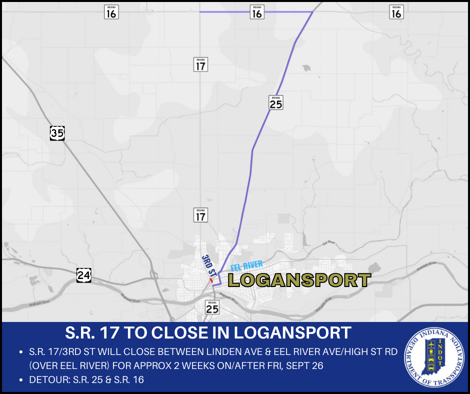 State Road 17 between Linden Ave. & Eel River Ave. / High St. in Logansport to close on or after Friday, Sept. 26, 2025